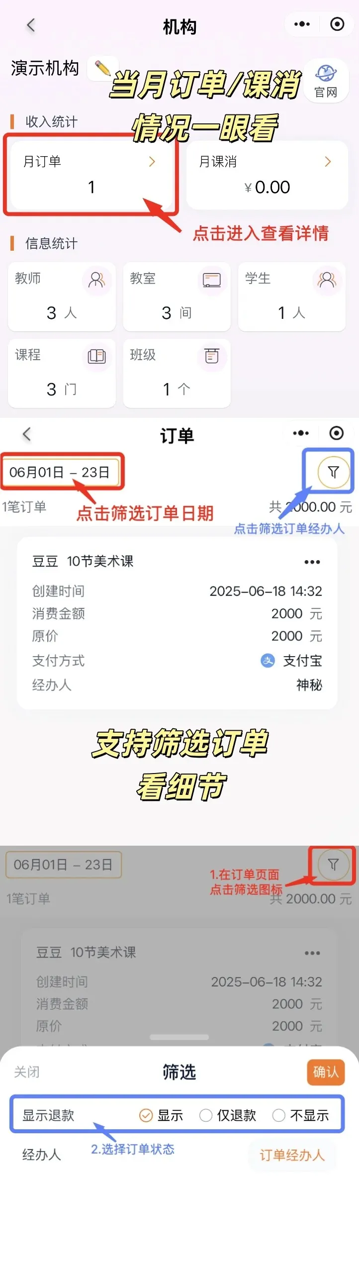 首页「机构」页面直接显示当月订单数和收入金额,点进去连每笔订单的经办人、日期都标得清清楚楚