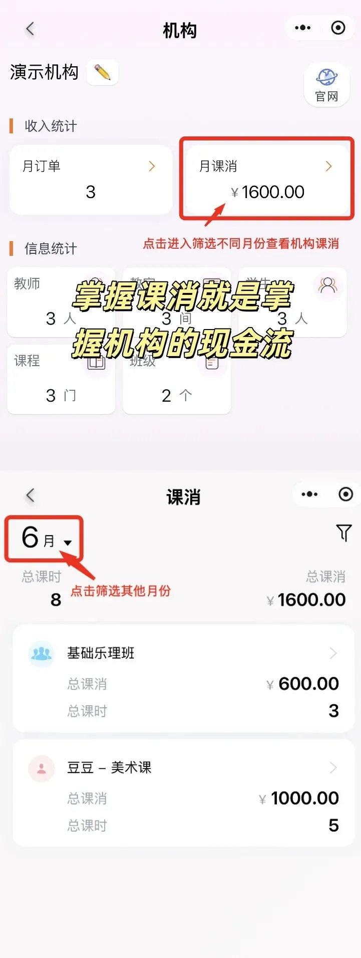 机构主页直接看「课消情况」,选月份就能查总课时 × 总课消
