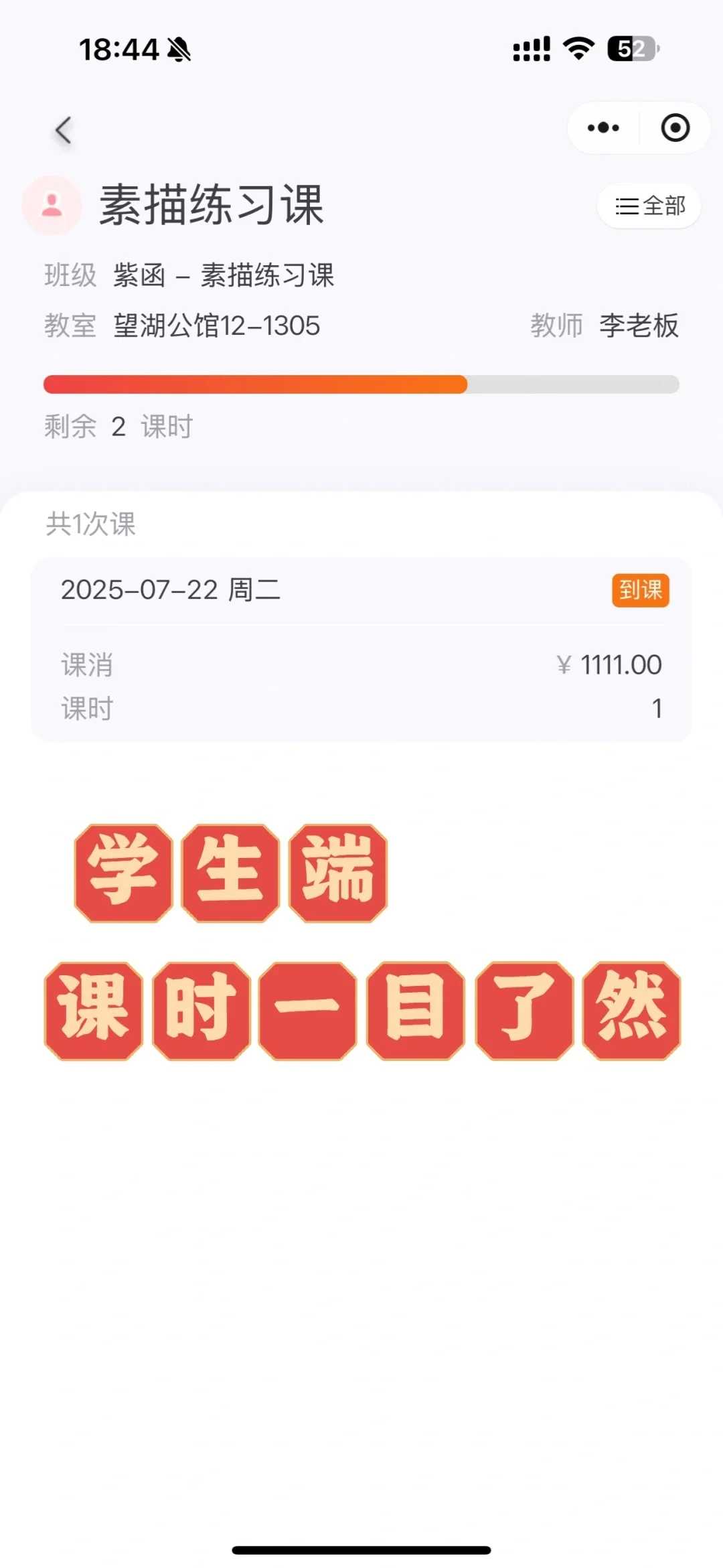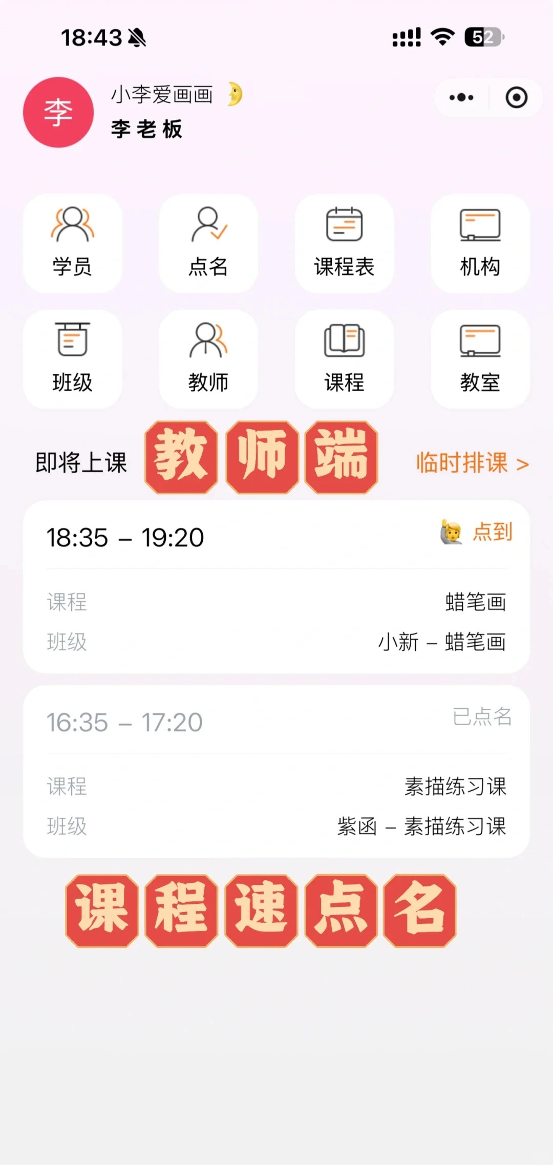 提升效率:排课、记课、汇总报告,一个小程序全搞定;再也不怕漏记漏报,每节课自动提醒,还能即时生成工作报告。