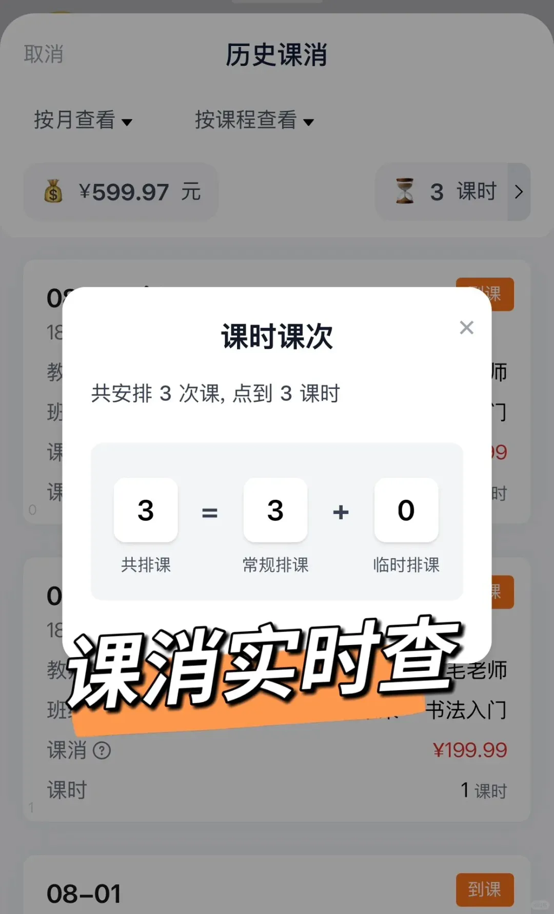 签到后课时立刻更新,机构后台随时查看,上了多少课一目了然